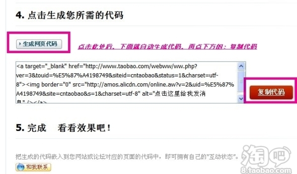 4,生成了网页代码后空白处会出现一大排的代码,这个就是你自己的旺旺客服账号生成的代码哦,再点击下面的复制代码字样,这样代码就自动复制了,一会直接插入到我们的店铺。