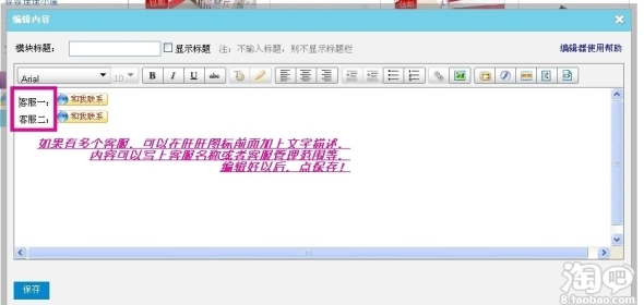 13,然后再这里开始编辑您想设置的客服的名称,是售后啊,还是销售啊,还是小二啊,还是快递查询啊等等,可以把营业时间也设置再这个自定义区域里面,设置完排版后点击最下面的保存按钮。