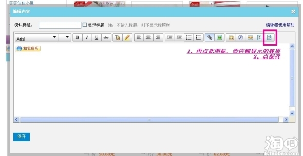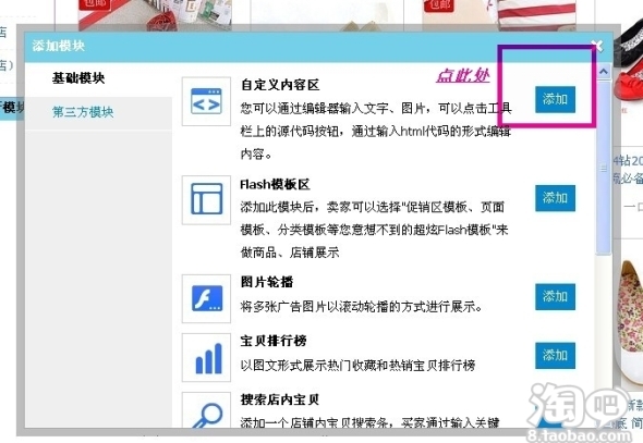 温馨提示:如果您是旺铺扶持版的店铺,店铺左侧是没有“自定义内容区的”也可以同样的方法,在右侧添加一个自定义模块喔!
