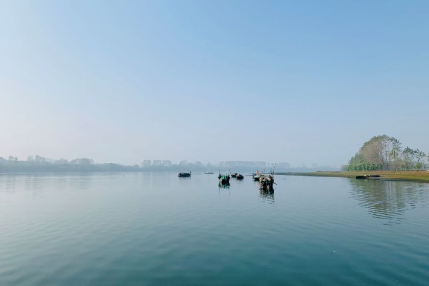 江水里,几艘木船横漂着,两边绿树掩映,倒映江中,江水变成了绿色,木船仿佛漂浮在草原之上,宛若一个世外桃源。