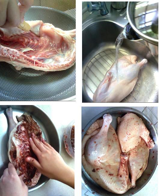 1。将半边鸭仔细去掉里外残存的杂物后用清水洗净后,用钢签或竹签在鸭身内肉厚的部位密密的刺洞, 让腌料容易入味。洗净后可以用半茶匙的红麴米粉搽遍鸭皮让它上色,烤出来的成品色泽会比较漂亮。可参考简简单单在家烤全鸭的做法。