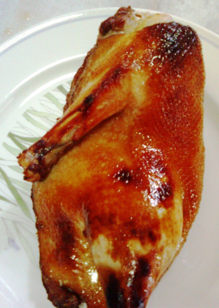 没等风干透就下去烤, 结果色泽就不完美囖!下次会再试试看,再把完美的烤鸭PO上来。)