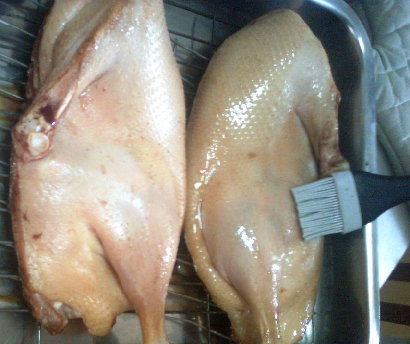 5。第二天,将腌渍好的半片鸭取出,仔细涂搽脆皮料刷遍鸭子全身。