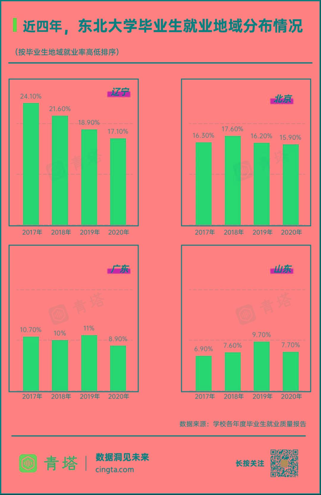 2017届东北大学毕业生留在辽宁省内的比例为24.1%,一年后,这个比例降至21.6%。到了2019年,仅剩下18.9%的毕业生在辽宁就业,比流向北京的毕业生占比只高出了2.7个百分点。2020年,东北大学毕业生留在辽宁省内的比例再次下跌,仅17.01%。