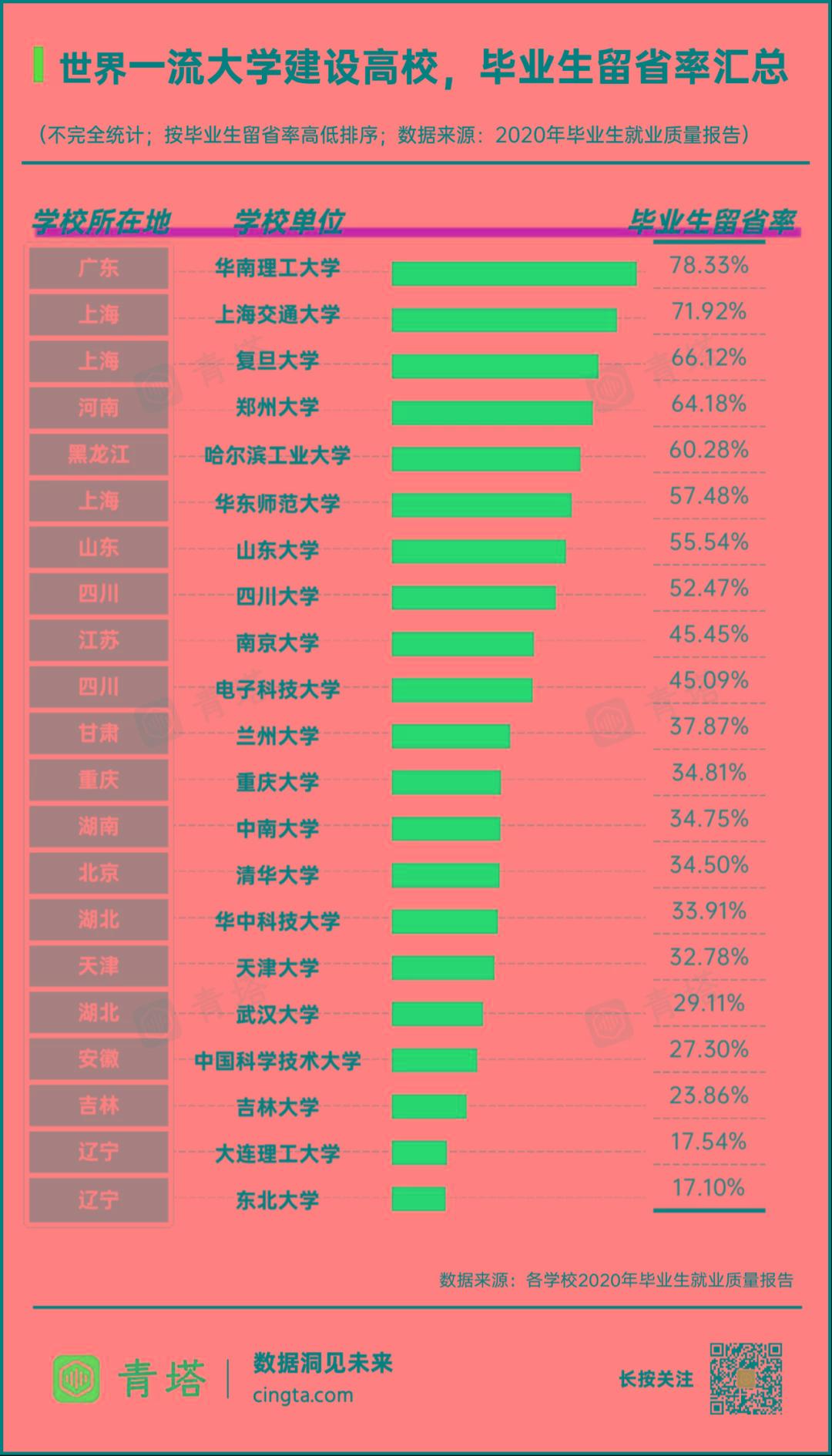 青塔统计了42所世界一流大学建设高校毕业生就业时的留省情况,希望能更鲜明直观地向公众展现顶尖高校的人才流动情况。