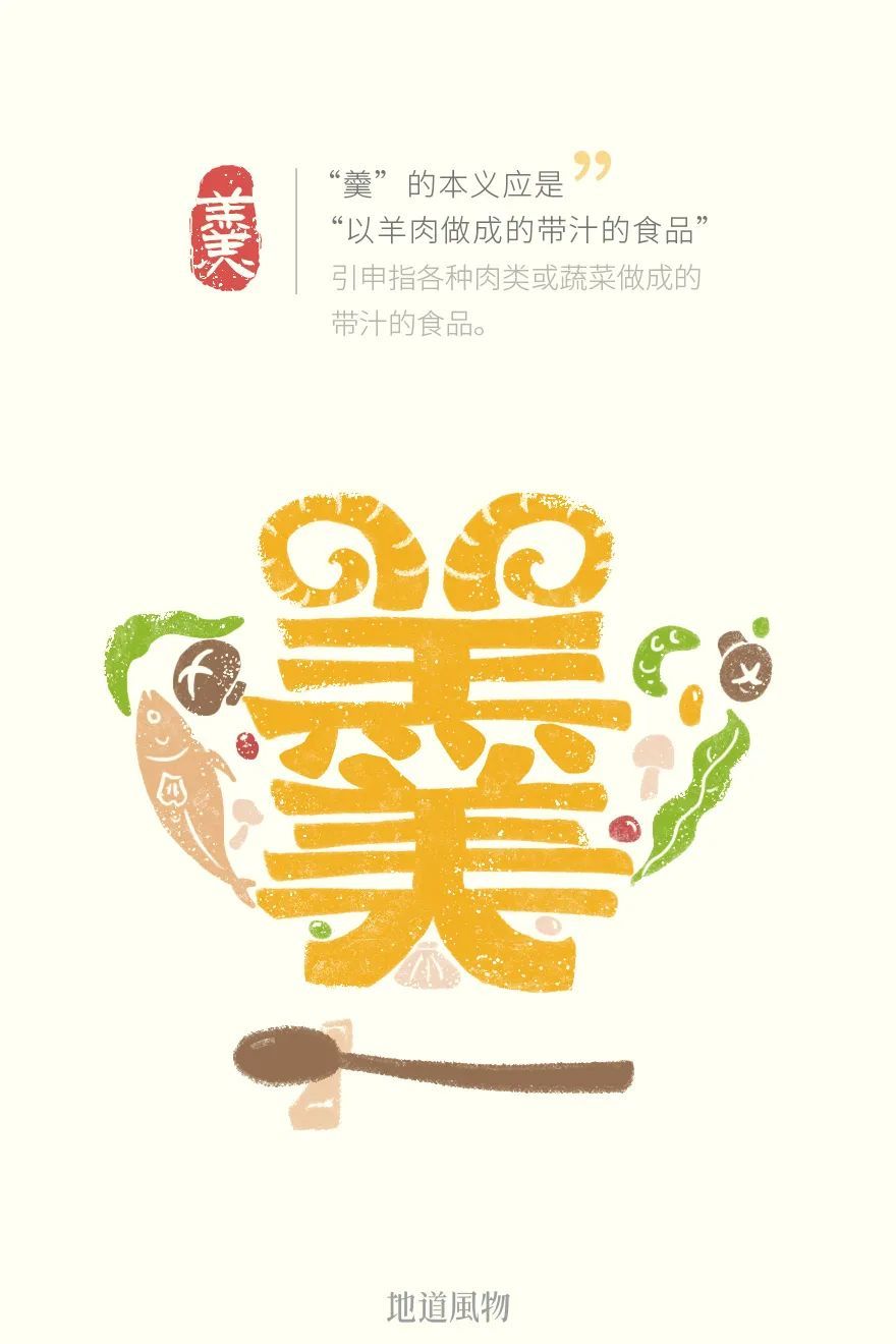 羹的本义是以羊肉做成的带汁的食品。作为一个典型的会意字,将“羹”字上下拆开,得到“羊羔”的“羔”与“鲜美”的“美”,可以清楚领会此菜滋味。