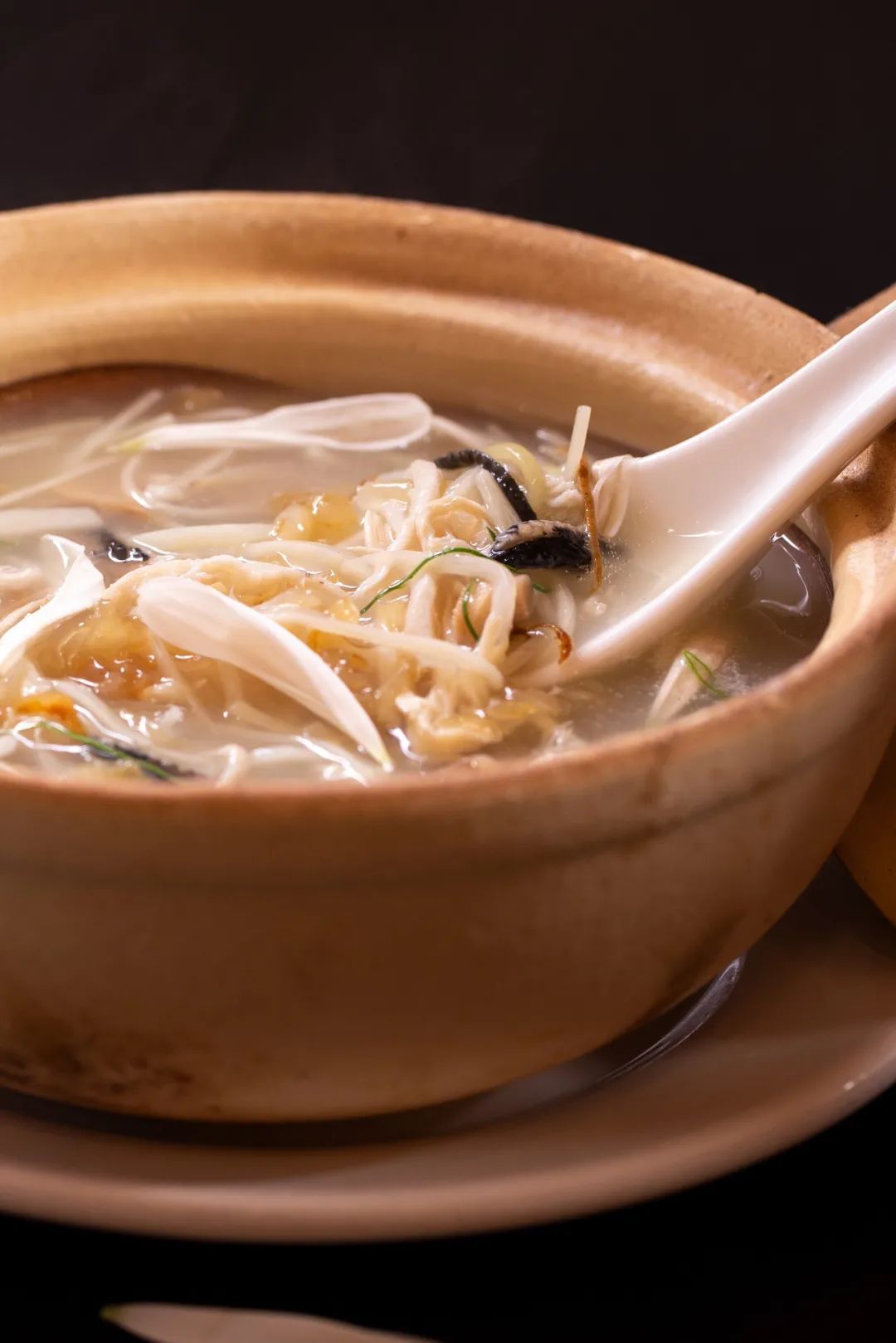 剔去皮与骨的鳜鱼、鲈鱼,在鸡汤的浸润下格外油润鲜香,火腿丝、香菇、竹笋末的加入,赋予了鱼羹额外的咸鲜风味,初入口中,与蟹肉竟有几分相似。