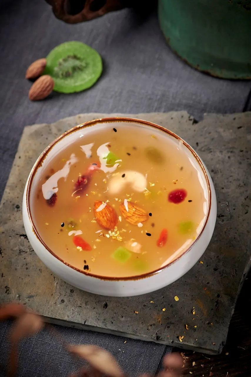 作为甜羹的一种,八宝羹以糖汁、银耳汤作为汤底,加白糯米、百合、莲子、蜜樱桃等同煮一锅,吃起来给人的感觉并不厚重,格外清甜。