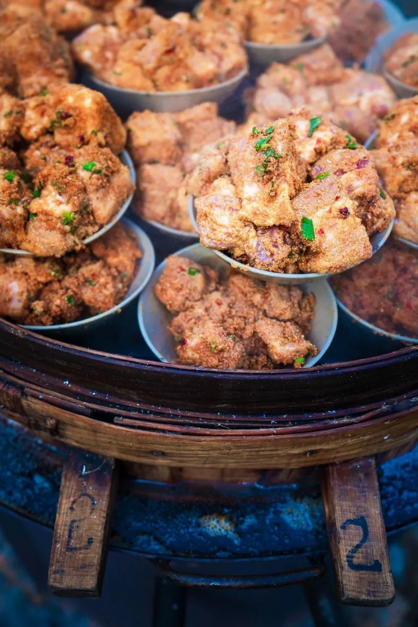 到了今天,在南昌松湖地区仍然保留着最古老的粉蒸肉做法。五花裹上米粉,以菜叶做垫,直蒸至肉与米粉半融半化,吃上一块,只觉得酥糯爽口、清香油润。