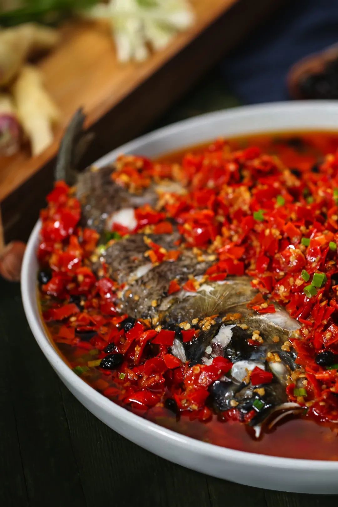硕大一个鱼头,加入满满的剁椒,配上姜、蒜、豉油推进蒸笼,细细慢慢地蒸个透彻,吃起来极其鲜辣细嫩。