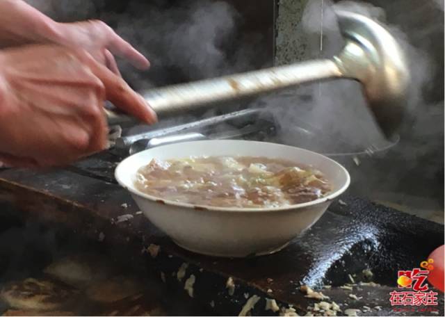 一口牛肉老汤需要反复炖煮,而且时间越长味道越香。特制的火烧在充满牛骨汤的大锅里,泡的发涨发软的时候,捞出火烧横两刀竖两刀切成块入碗,扬勺加一口老汤,捏两片酱牛肉和一把小香菜即成。