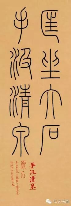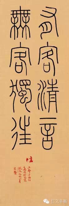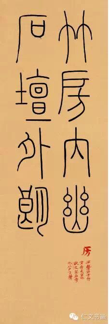 其次,我看到的建胜兄是以为年轻的书家。他对书法的喜爱缘自幼小时家庭环境的影响,随后的读书生涯更让他对笔墨产生了深深的向往之情。在他的学书道路上,有陈忠康先生的启蒙,有张如元、林剑丹、季惟斋、戴家妙诸夫子的教导与提携。对于一个书法艺术的学习者,在学艺之初便能得到这些前辈师长的提点,可谓是莫大的福缘。在众多师友的帮助下,建胜兄用心最多的是篆书、隶书作品中,我们可以明显地感受到他对点画、结体、线条这些书法艺术基本元素的领悟,而更可贵者,他并没有完全止步在这些技法元素的结合中。书法作为中国传统文化的重要一支,他所体现的不单纯是汉字的书写艺术,更深层次者,是它对中华文化的延续作出的贡献。对由“法度”而向“道术”的深入,是建胜兄书法作品中最值得关注和体会的方法。他形神逼肖地去临摹《兰亭序》、《祭侄稿》、《寒食帖》,这是他对于书法流变的重视。而在一件隶书临作中,他又写出另一种体悟:“余习隶一载,汉碑名品皆所涉,常随手涂抹不成篇,尤喜带入篆法于其间。”这看似矛盾的临帖指向,正反映着建胜兄对于书法艺术更进一步的追求。如果说建胜兄的行草书还在逐渐进入传统的阶段上,那么可以说他的篆隶作品已经是在熟悉传统之后,个人体悟逐渐显现并强化的阶段了。正如他提到的“尤喜带入篆法与其间”,这一观念在他的很多篆隶作品中都有所体现。他在隶书中慢慢变化出篆书笔意,而在以小篆为主体的篆书作品中又时有古文字法和篆书形体变化的渗入。这使得建胜兄的篆隶作品在浓郁的文人气质基础上更增添了高古肃穆的意味。而这笔下点线形体的些微变化,使建胜兄的书法特立于人们“八零后”书家群体。