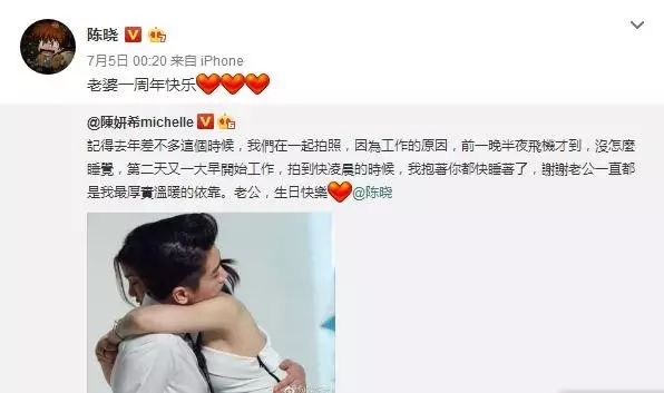 上个月是两人结婚一周年,也是陈晓的生日,陈妍希特地发微博回忆祝福。陈晓随后转发:老婆一周年快乐。