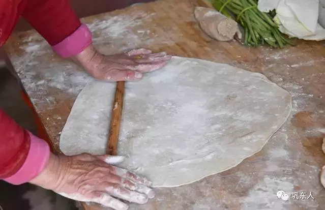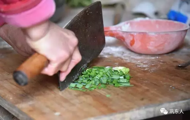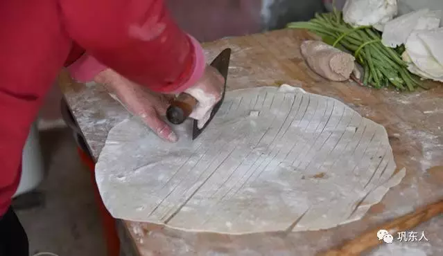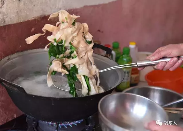 一个剂子擀一张面皮,然后用大刀切成宽面条,由于怕粘在一起,一般切一张面皮,就下一锅面条。