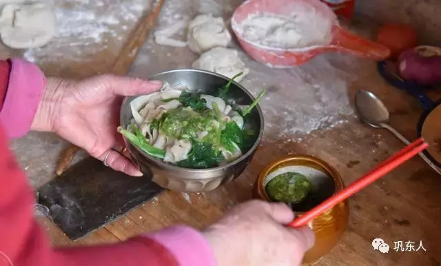 捣好的蒜苗泥,加入水、盐、调料、酱油、醋和小磨香油,当然也少不了农家自炒的红辣椒。