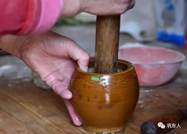 农村自然存放的蒜瓣,在春天已经失去了应有的味道,还好菜园里的蒜苗鲜嫩,索性就把蒜苗切碎,放在蒜臼里捣成泥。