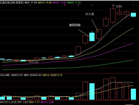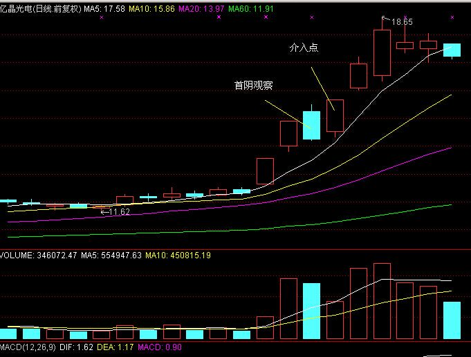 那么今天讲的课题,从形态和量能上来看,就是首阴,缩量。首阴出现后,当天收盘之时先看量,首阴当天不能放爆量,缩倍量最理想。如果说比前一日放量20%以上,就要大打折扣了。我们基于这一形量来分析首阴后的第二天。对于首阴当天来说,如果是杀跌出货,那么第二天早盘一般来说都会低开,因为毕竟是要出货,没有资金会去主动维护股价。但是,如果第二天的盘口是开盘高开,就会有两种可能:一是前一日长阴杀跌是假象,实为洗盘;另一种可能就是高开诱多,吸引买盘跟风,实为出货。