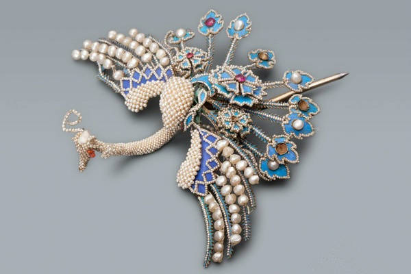 【珍珠凤凰发簪】沈阳故宫博物院藏,为清末帝溥仪皇后婉容御用之物。由点翠、大小珍珠、米珠组成凤凰形状,凤头昂起,双翼张开,凤尾饰有九枝花翎,其上镶有珍珠和宝石。