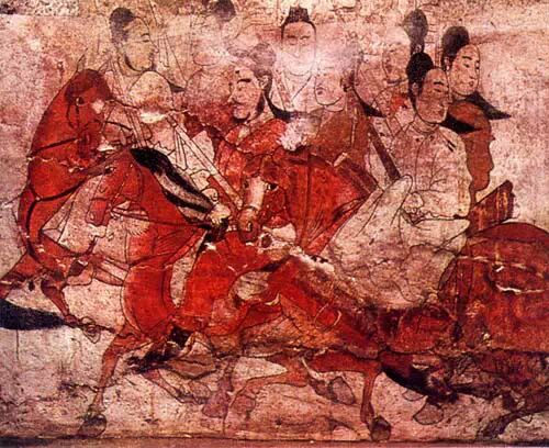 属北齐时期,1979年山西太原娄睿墓出土。《鞍马出行图》位于墓道西壁中栏、作长卷式展开:风嗖嗖,旗猎猎,远征的人儿出发了!莫道行程远,何惧路奇艰,手执弓,身佩剑,扬锐气,策骏骑,纵然千山万水,也要勇往直前。马嘶鸣,回首望,召唤身后的马队,快加鞭,紧跟上,越过前方的大山,将是我们的猎场……整个画面层次分明,构图新颖,人物生动,表情逼真,生活气息浓厚,表现技法娴熟,堪称中国绘画史上的精绝之作。现藏山西省博物馆。