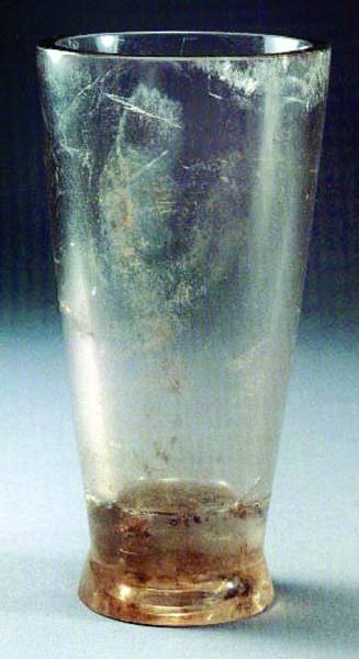 属战国时期,1990年杭州半山镇石塘村战国墓出土。高15.4厘米,敞口,斜壁,圆底,圈足外撇。素面无纹饰,透明,器表经抛光处理,器中部和底部有海绵体状自然结晶。此杯是用优质天然水晶制成的实用器皿,国内罕见,其制作技巧和工艺水平令人惊叹。现藏浙江省文物考古研究所。