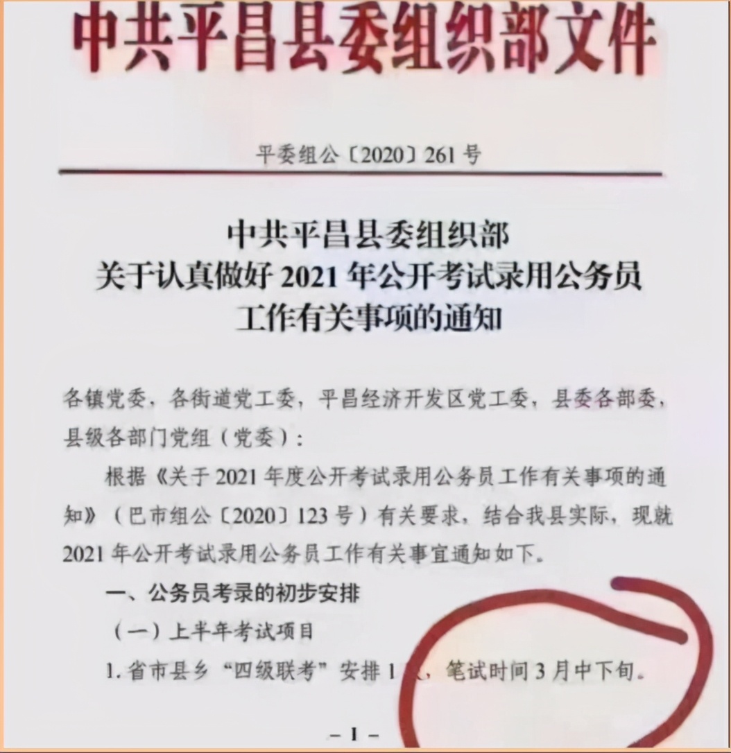 四川省平昌县委组织部发布认真做好2021年公开考试招录公务员工作有关事项的通知中也明确说明笔试时间3月中下旬。