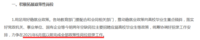 日前教育部发布的《教育部关于做好2021届全国普通高校毕业生就业创业工作的通知》中,对2021年公职类招录时间做出了明确指示:2021年6月底以前完成全部政策性岗位招录工作。