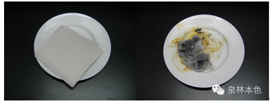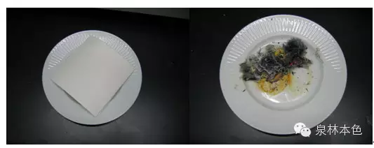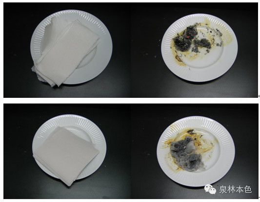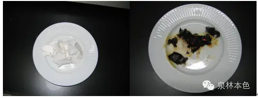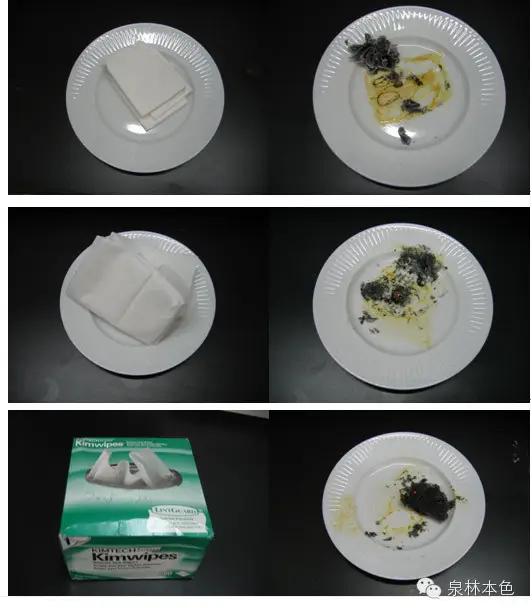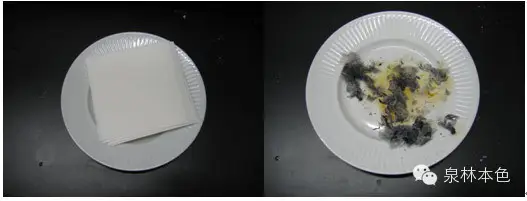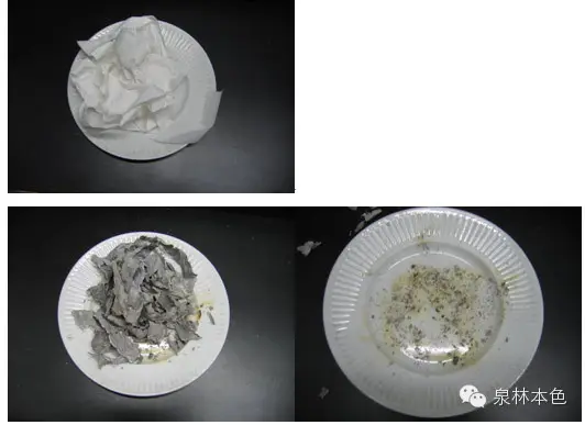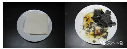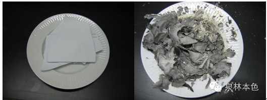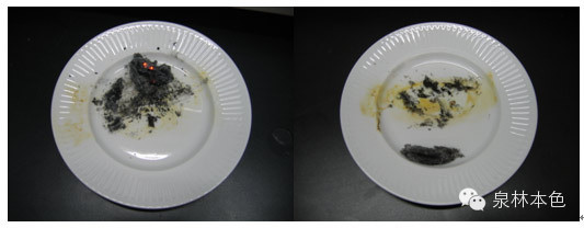 分别选择国内两种知名品牌卫生纸进行燃烧,两种产品均采用原生木浆生产,结果见图7。结果表明两种卫生纸燃烧后均产生了黑灰和焦油状物质。