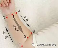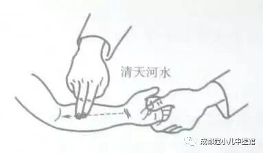 清天河水方法:用食、中二指指腹,自总筋(腕横纹中央)起,推至肘横纹,动作要轻、快,可以用水、滑石粉作为介质,推拿约200-400次。