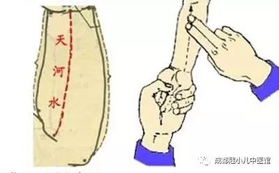“天河水”出自《针灸大成·小儿按摩经》,位于前臂正中总筋至洪池成一条直线。也就是在前臂内侧的正中线上。