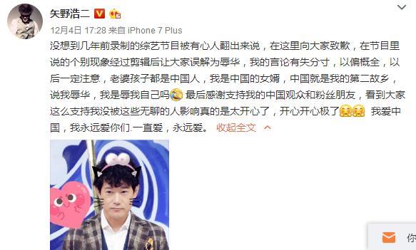 当然了本来一件很小的小事,被营销号带节奏之后,矢野浩二立马意识到自己政治错误,随后在微博上面道歉,表示自己爱中国,将会永远爱下去。说真的,矢野浩二真的是一个很不错的日本人,妻子孩子都是中国国籍,通过这件事国人应该意识到自己素质方面的问题,古人就有云,取其精华,对于好的东西我们为什么就不能够学习呢?