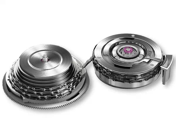 最后一个词,也是今天重要的词就是芝麻链,这是一个与陀飞轮有着同等重要地位的专业词汇,也是中国人给这个结构取的一个形象的名字。更为专业叫法在后面多加个“儿”。我们知道,发条是机械钟表的原动力。一般的发条在满弦状态时的力矩大,随着钟表的不断运行,发条力矩逐步减小,钟表的走时精度也会随之改变。芝麻链传动系统是一项尖端精密的早期发明之一,应用于发条驱动的机械钟表,它确保钟表的齿轮系统一直由相同的扭力来驱动,而不受发条上条状况的影响。这个装置改善了表的精准度。芝麻链是钟表发条力矩的稳定器。它由芝麻链、条盒、塔轮三部分组成。芝麻链与自行车链条很相象,只是链节非常细小,犹如芝麻粒大小,因此起名叫芝麻链;塔轮的形状好似宝塔一般呈锥状,塔身上下布满沟槽,供芝麻链缠绕。芝麻链缠绕在条盒外壁上,说明发条已经释放完毕,如果是满条状态,芝麻链应该完全绕紧在塔轮上。