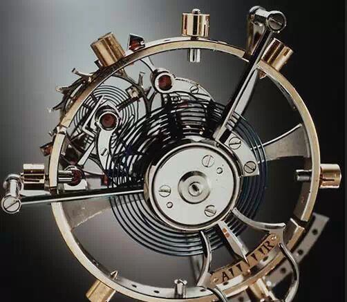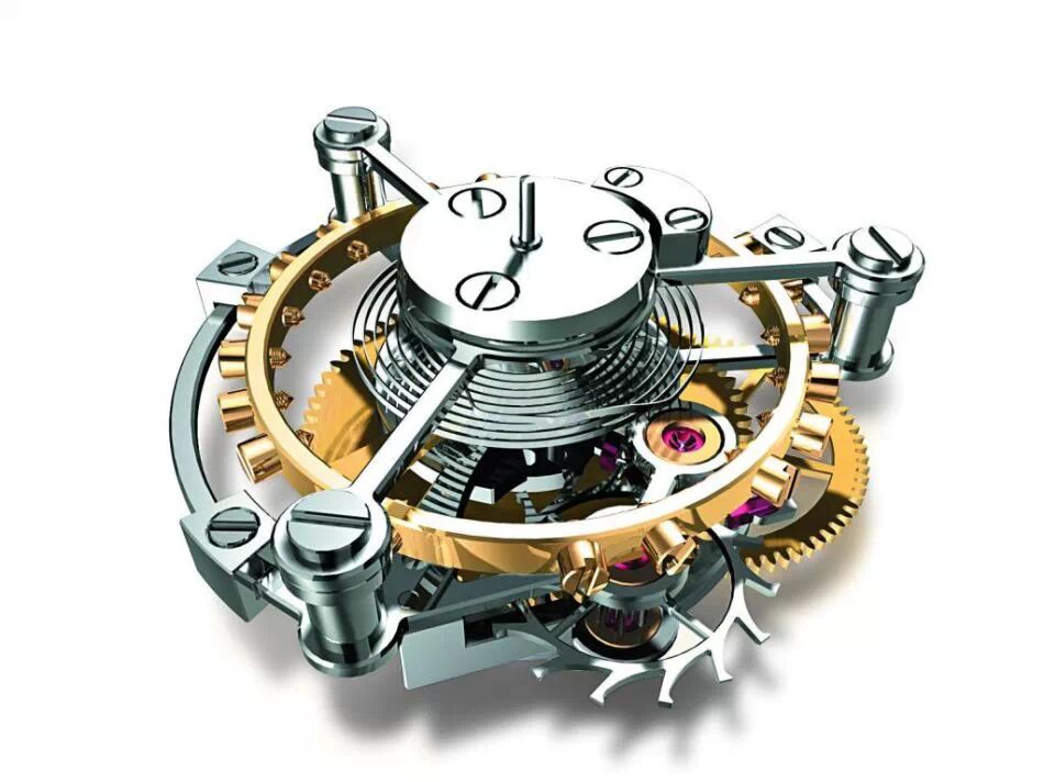 陀飞轮——把擒纵调速机构纳入一个可以旋转的笼架内。因为地球引力会造成钟表的位置误差,为了减少地球引力对钟表走时精度的影响,通过陀飞轮机构每一分钟旋转一周,把钟表的位置误差进行平均,是在当时的技术条件下,是提高钟表走时精度最有效的方法。