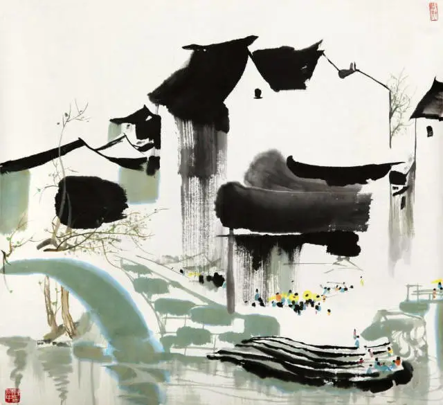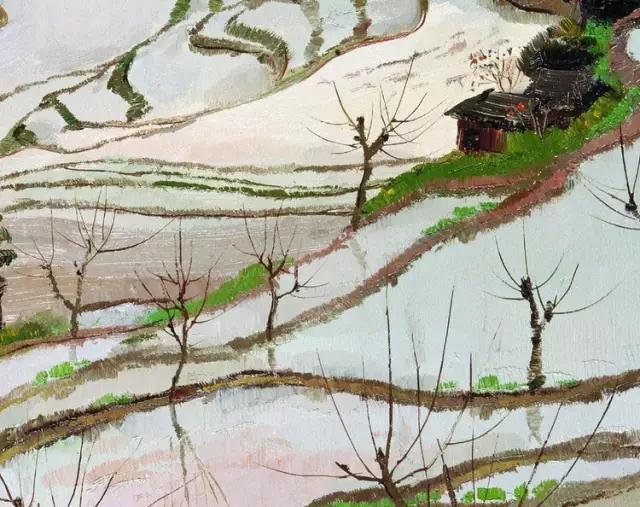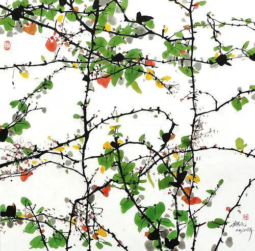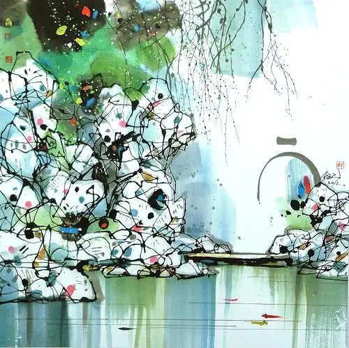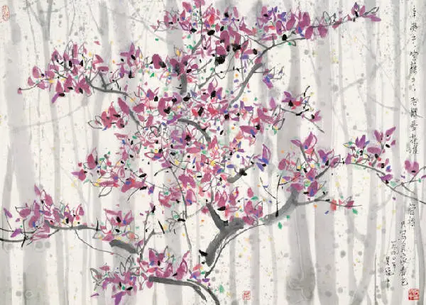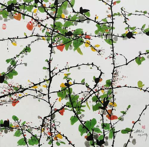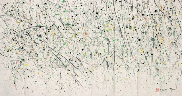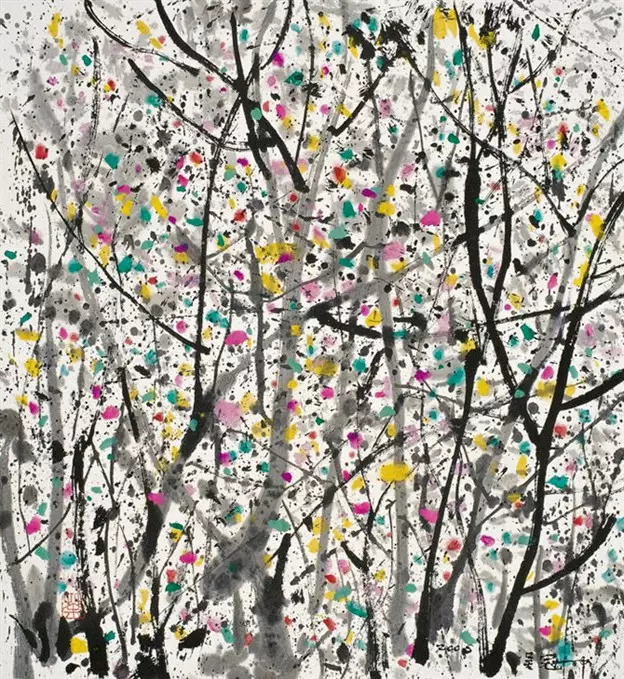 吴冠中老先生的《春》坠入线之罗网,用线来绘写春天,表现春光之易逝,人间留不住朱颜,留不住青丝,今日丹青正艳,放歌狂舞,更遇彩点纷飞,人间欢乐长留画中看。从具象的紫藤之纠葛发展到抽象的“情结”,纵横交错,上下遨游,线在感情世界中任性奔驰。