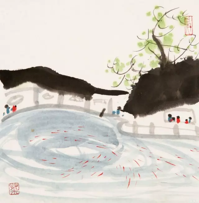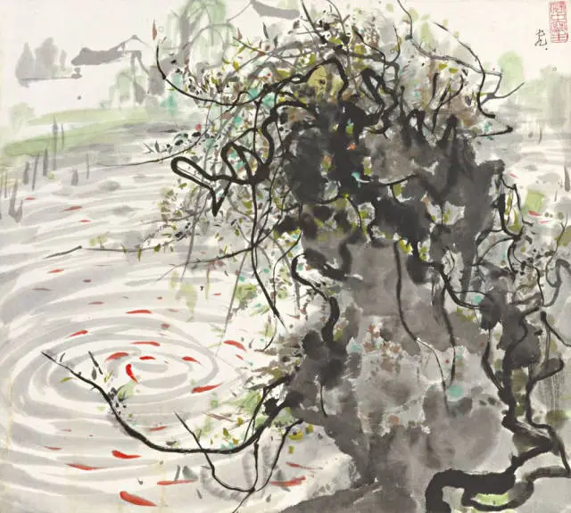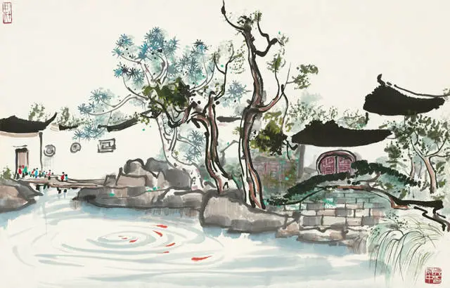 小亭的一角,绿树红花点燃了整个院子,却只有鱼儿噙香而醉。