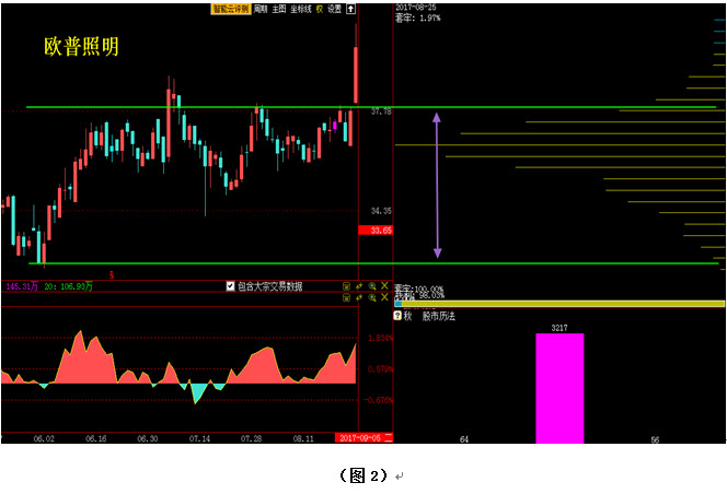 如图2所示,我们看到该股在向上突破的当天,有以下几个特征:第一、既然是形成突破,所以在2017年8月25日这天,该股的上攻力度会相对较强,K线长度也会比较大,一般来说会有5%左右甚至更高的涨幅;第二、该股由于长时间在低位横盘震荡,所以大量的筹码都集中在33元到38元这个价格区间之内,这些筹码不会在该股向上突破的当天就发生迅速向上转移;第三、突破前期该股就已经开始有资金不断进场,做着准备工作,在突破当前,资金进场量更是呈现放大状态。