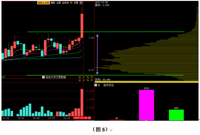 如图5所示,2017年12月29日滨江集团收盘价是7.95元,以该价格为基准,在其股价下方20%的位置是6.36元,在其股价下方5%的位置是7.55元,从图中可以清楚的看到,在2017年12月29日这天,该股下方6.36元至7.55元之间存在着一个巨大的筹码密集峰。可见涨幅条件与筹码条件都已经符合,最后再看一下该股下方的五日多空资金,不难发现,该股在突破前就已经开始有资金连续进场,2017年12月29日突破当日资金更是大幅抢筹。故此该股就是我们要寻找的目标个股之一,投资者可以及时买入。用同样的方法,您也可以去看看另外两只在图4中被圈出的个股,如果资金条件同样符合,那么它们也是我们要寻找的目标个股。对于这些找到的目标个股,大家则可以依据个人的实际情况,分仓及时介入。