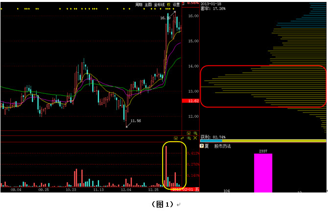 。错过:股价由筹码密集区向上突破的第一时间-----市场短期调整过程中,有些股票可能会在小幅整理后再次上涨,逐渐步入长线走牛状态;也有些股票则可能大幅回落,甚至跌回到原来的筹码密集区当中。对于这两种个股,大家当然是愿意买第一种个股,可是这种个股如何找出来呢?别急,下面咱们就来详细的讲解一下。见图1: