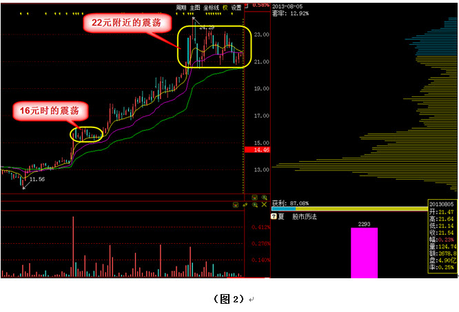 如图2所示,该股在16元附近震荡一段时间后果然再次向上突破,并不断震荡上扬,一度上摸到24元上方,以涨幅来看,16元至24元为50%!随后该股故伎重演,围绕22元开始了又一次的震荡。不过不论该股如何震荡,下方13元附近的筹码密集区都没有出现明显的上移迹象,说明主力依然不想离场,股价在后期仍可能继续上涨。那么对于持股的散户朋友来说,这时不要心慌,既然抓到了牛股,就要抓牢。对于持币想买的散户朋友来说,则可在震荡区间的下沿逐步逢低进场买入。