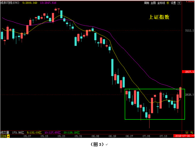 如图3所示,我们先打开大盘的K线走势图,找一个从技术上看似合理的突破点,比如在今年的7月23日,大盘依托5日成本均线再次收出中阳线,指数不仅向上突破了13日成本均线的压制,而且也突破了6月26日至7月23日震荡箱体的上轨。这种情况从技术分析上来说很有可能是行情启动的信号,所以在这天收盘后,投资者可以积极选股,考虑进场。