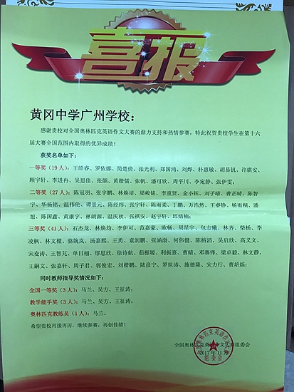 在刚刚结束的第十六届全国奥林匹克英语作文大赛决赛中,黄冈中学广州学校(简称:黄广学校)高二年级学生取得优异成绩。