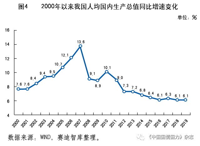 从发展历程看,美日德三国分别在人均国内生产总值1.7万(2012年不变价)、1.9万和2.0万美元(2010年不变价)时,制造业比重才开始出现下降。我国与日德同属追赶型经济体,2019年我国人均国内生产总值增速为6.1%,2010年以来除2017年呈现小幅增长外整体呈下降态势(见图4)。以移动平均法估算,未来20年假设以人均国内生产总值增速为4.5%进行测算,以2018年的0.7753万美元(2010年不变价)为基数,需要23年才能达到1.9万美元。即我国制造业比重开始下降或在2040年左右,人均国内生产总值达到1.9万美元(2010年不变价)左右时,较为合理。