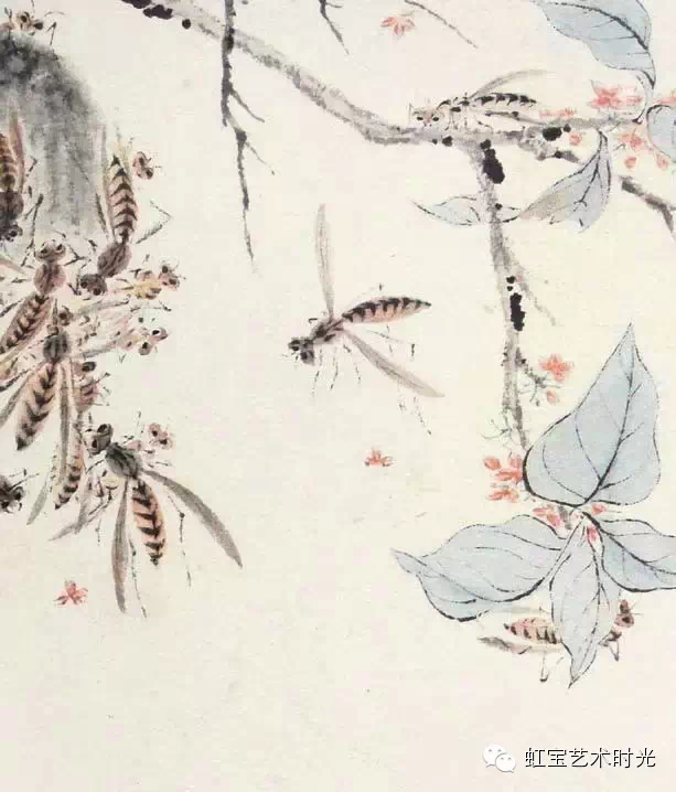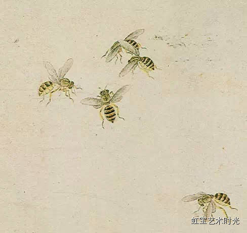 蜂的种类很多,比较常见的有蜜蜂、胡蜂、细腰蜂、长脚蜂、虎头蜂等等,这些种类的蜂在前人的作品中大多有所表现。蜜蜂的后脚跗节格外膨大,周围长着又长又密的绒毛,当蜜蜂在花丛中穿梭往来采集花蜜时,那毛茸茸的脚就沾满了花粉,这种能携带花粉的脚,叫携粉足。古人在表现采蜜的蜜蜂时经常强调出携粉足。