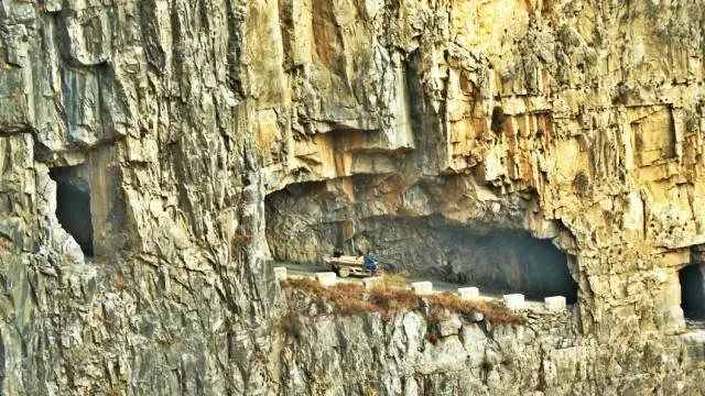 车又行驶了半个小时,大家已经分不清晕头转向的原因,也许是被眼前的景象所惊到,此时的感觉就像车停在斜坡三十度以上的断层岩壁上一般,司机说这就是锡崖沟著名的挂壁公路,挂壁公路是在悬崖峭壁上开凿而出的,为了施工方便和开通后取自然光照明,贴壁而凿,相隔十余米旁开一侧洞。