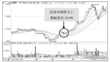 主力在洗盘时不仅对时间有严格的把控,对洗盘时的震荡幅度也是有控制的。一般来说,在底部吸货阶段的洗盘,回调幅度可以到达前期最低价附近,即等同于吸货空间。股价脱离底部后的洗盘,股价回调的幅度通常是前期拉升的1/3或1/2,如果前期是多重底部形态,则回调位置是形态顶部最高价位或比其略低的价位附近,最低不低于前期最低位。