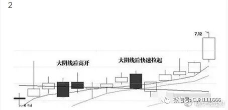 在股价缓慢推升至或震荡走高至60日均线上方时,由于大盘原因或主力刻意洗盘而出现几乎没有下影线的大阴线,形态极为恶劣。但股价第二天会高开或快速拉起,并不给散户抄底机会。这种形态显示了主力持筹不多,有急切拉高心理,不会进行较长时间或较为深幅的洗盘,一般选择市场合适机会快速拉高股价。这种形态多与星线配合。