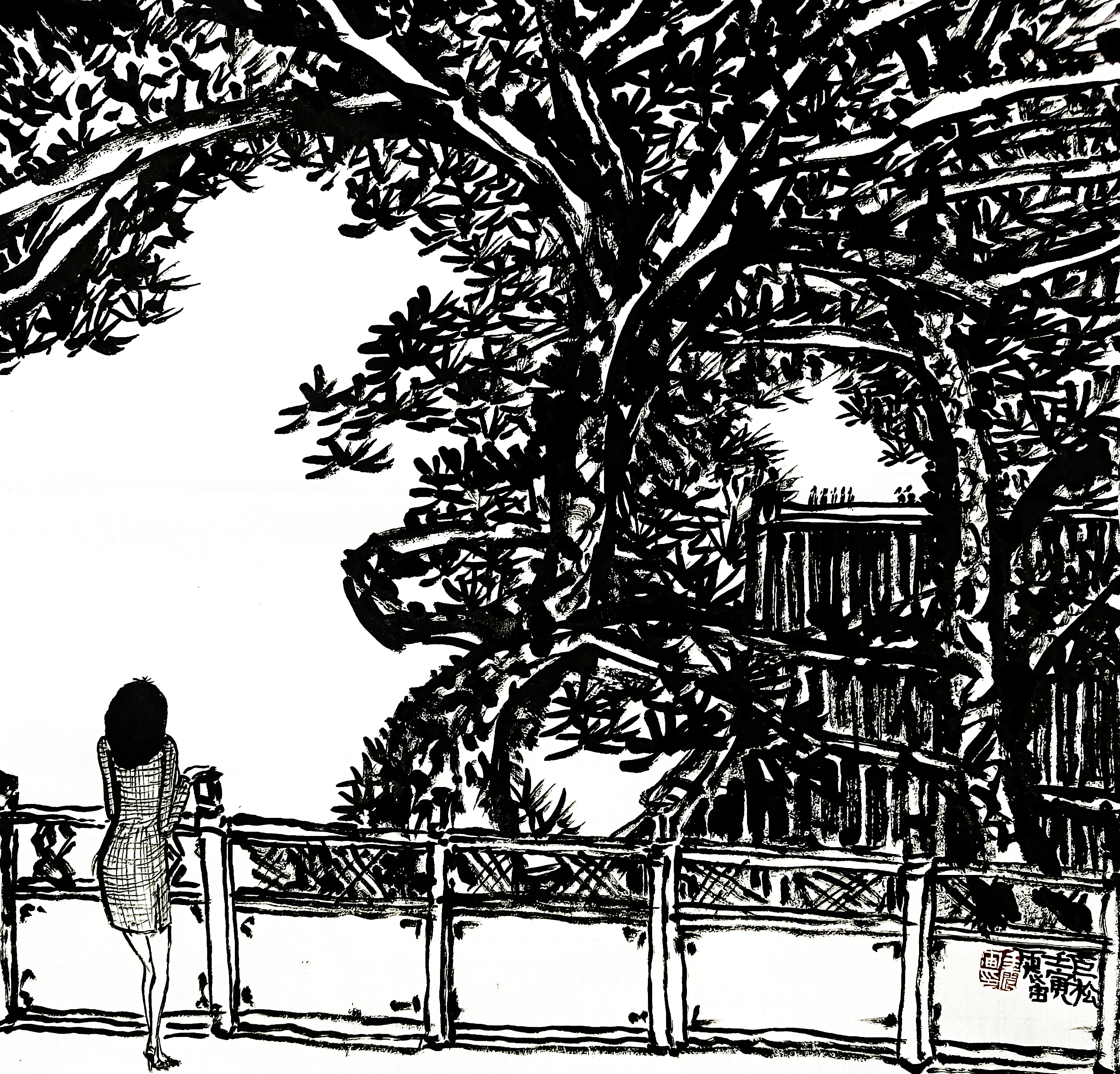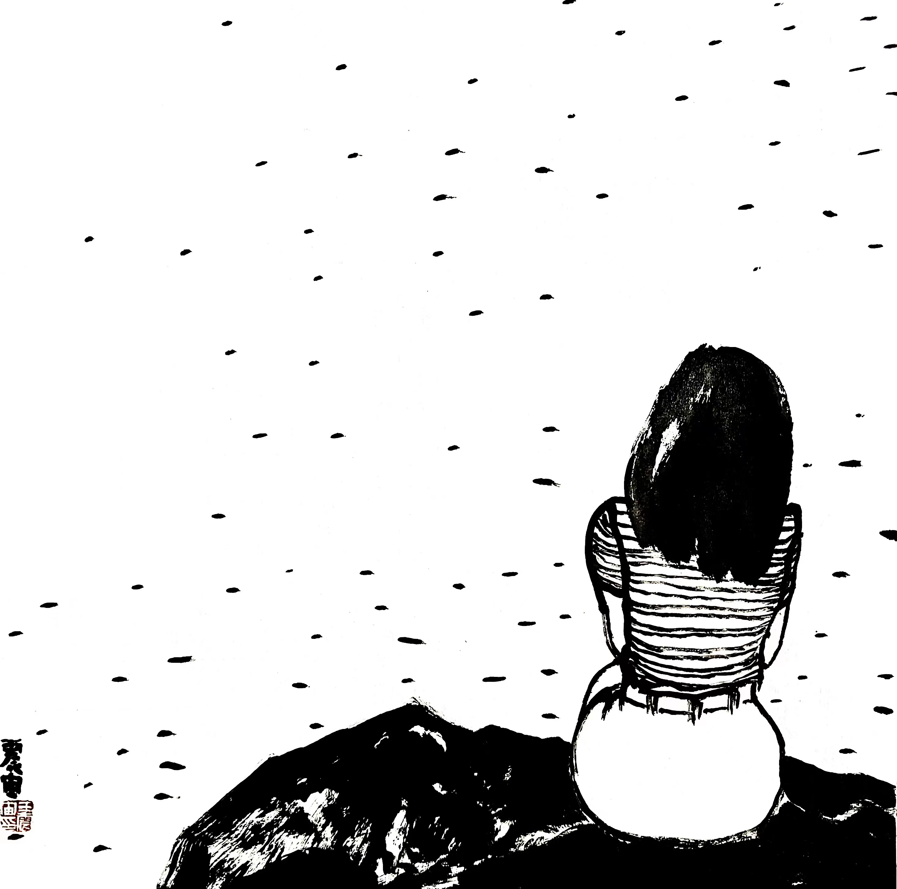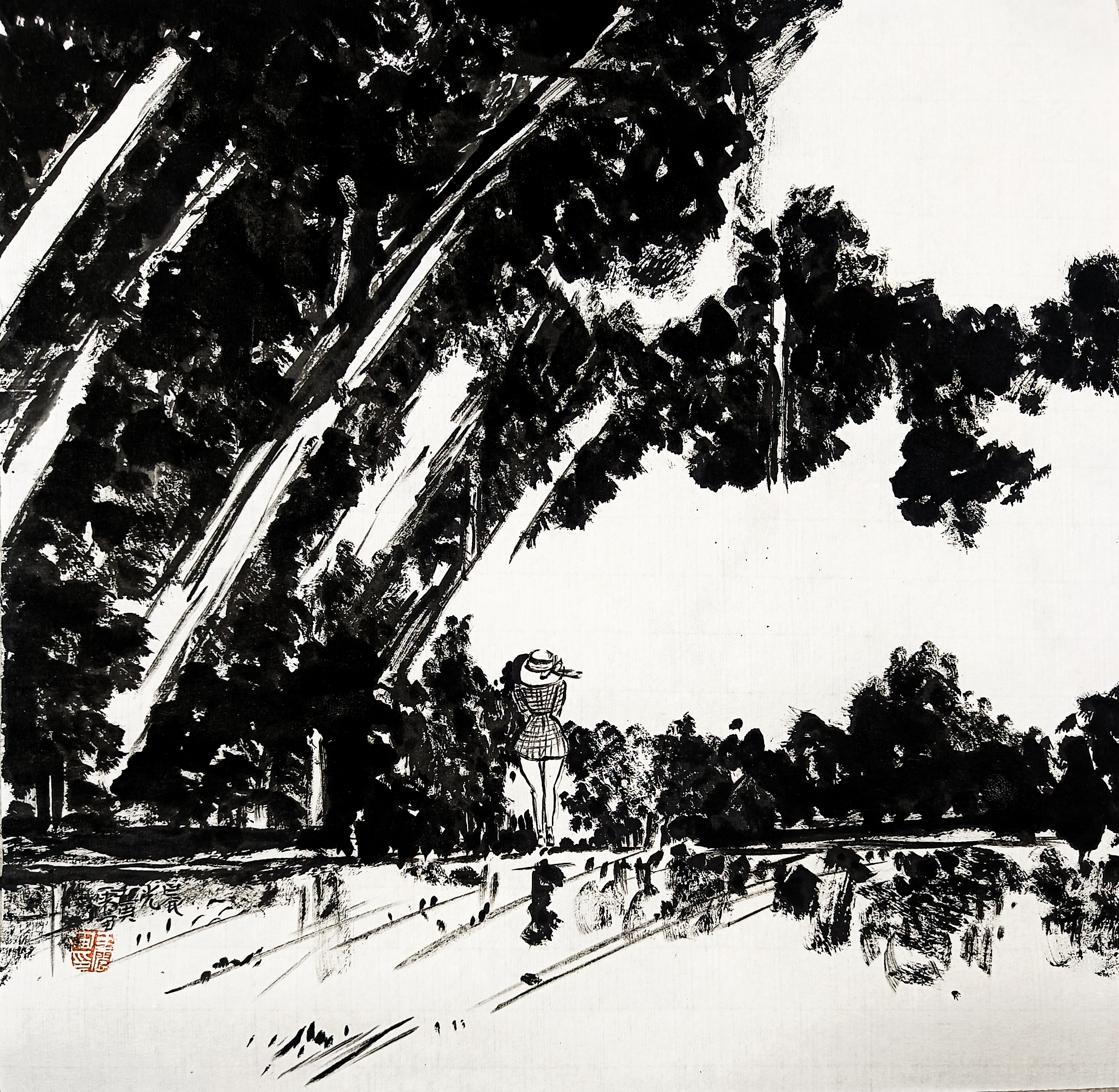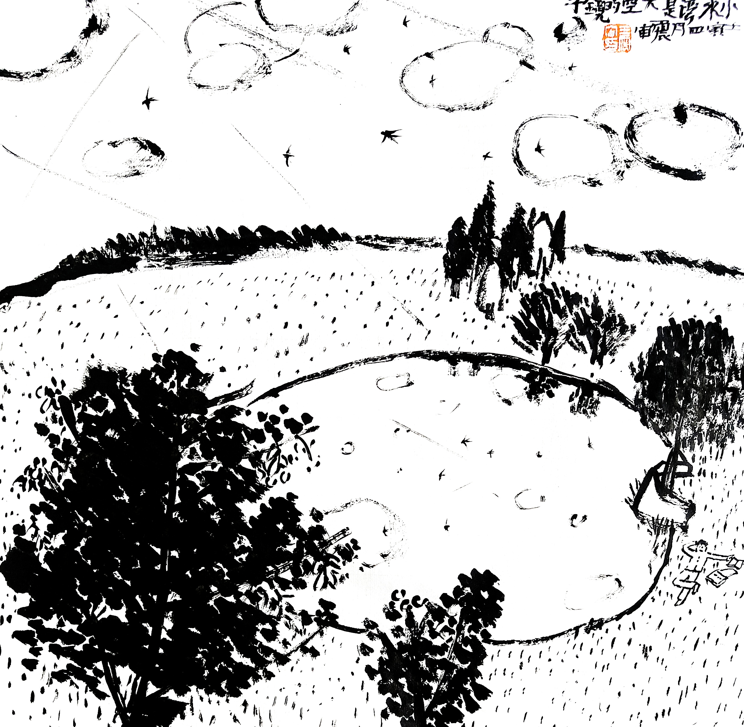 要说中国画笔墨里的“勾、皴、点、染”,显然他都是并不在意的,但在他的画中又看到了在中国画里近乎哲学意味的“既白当黑”,且被他发挥的淋漓尽致。我想,这正是他对中国画的理解再至研究思考的表现,不拘泥形式一味追古而将精神传承不朽,研究、思考、探索—这正是作为一个中国文人该承担的责任。