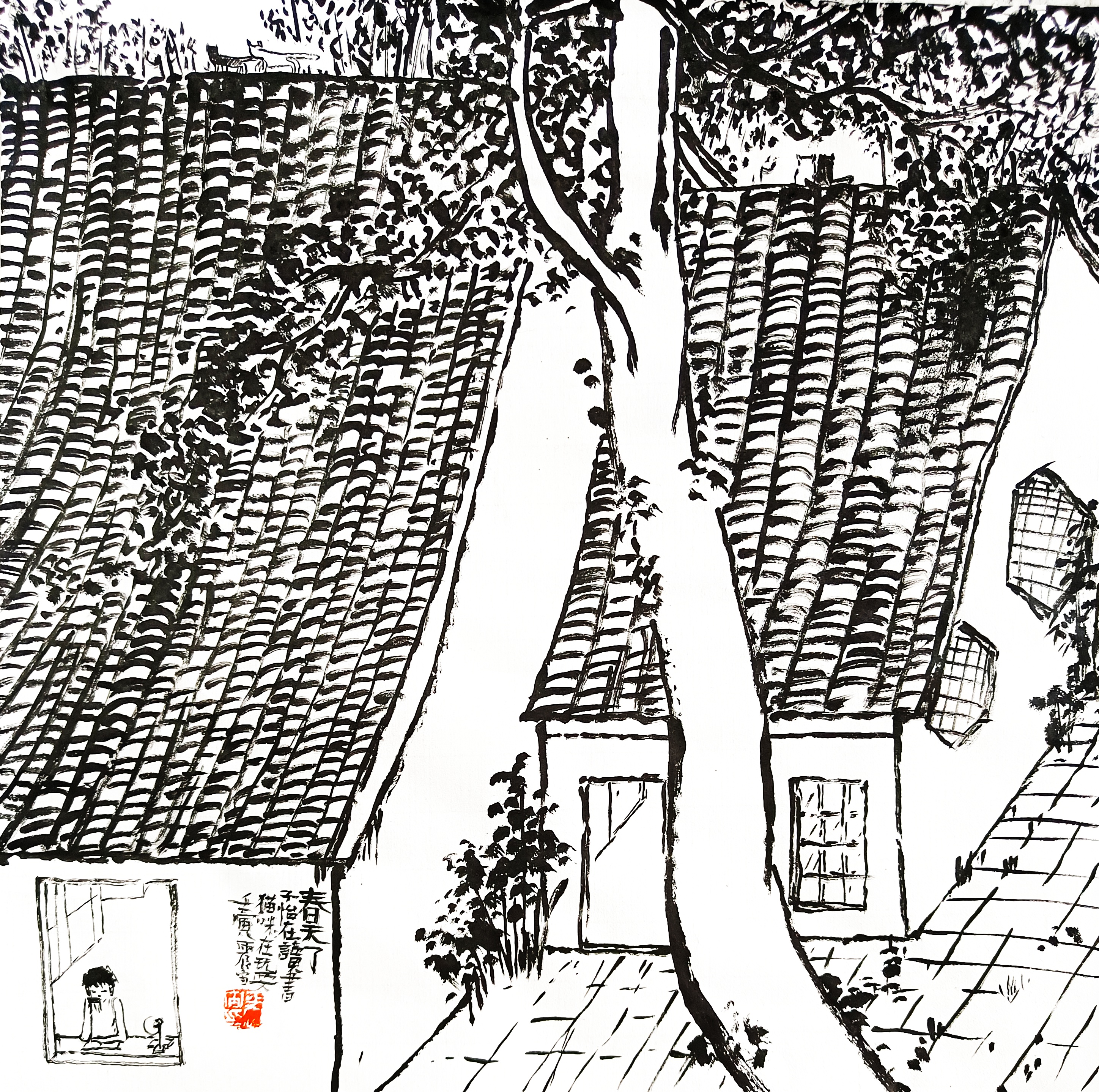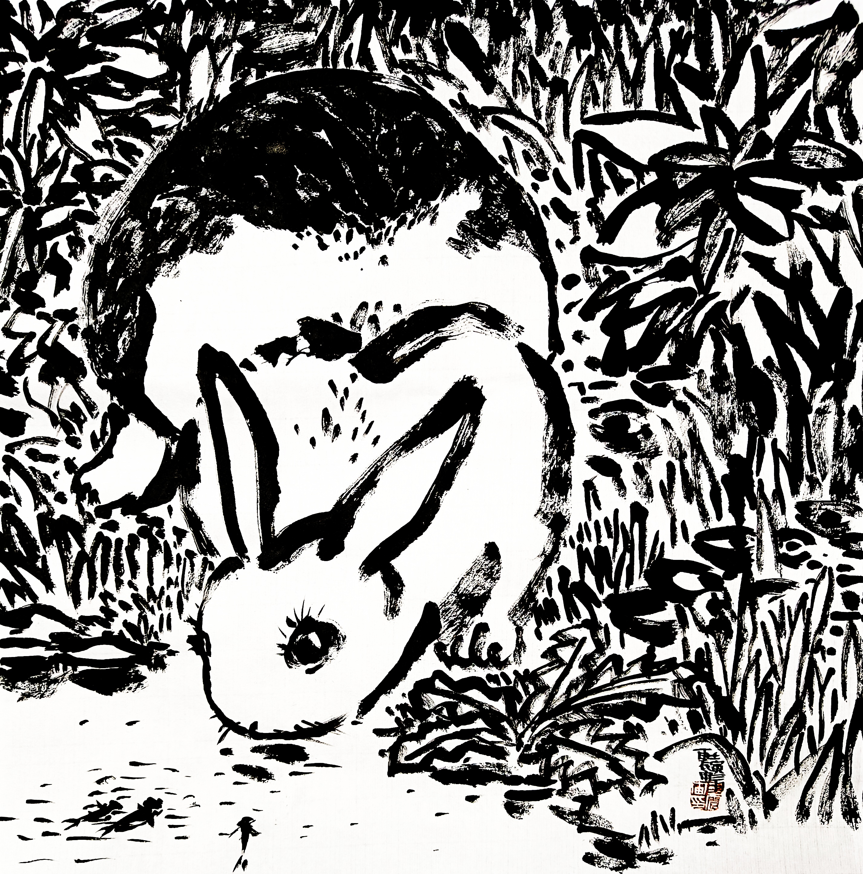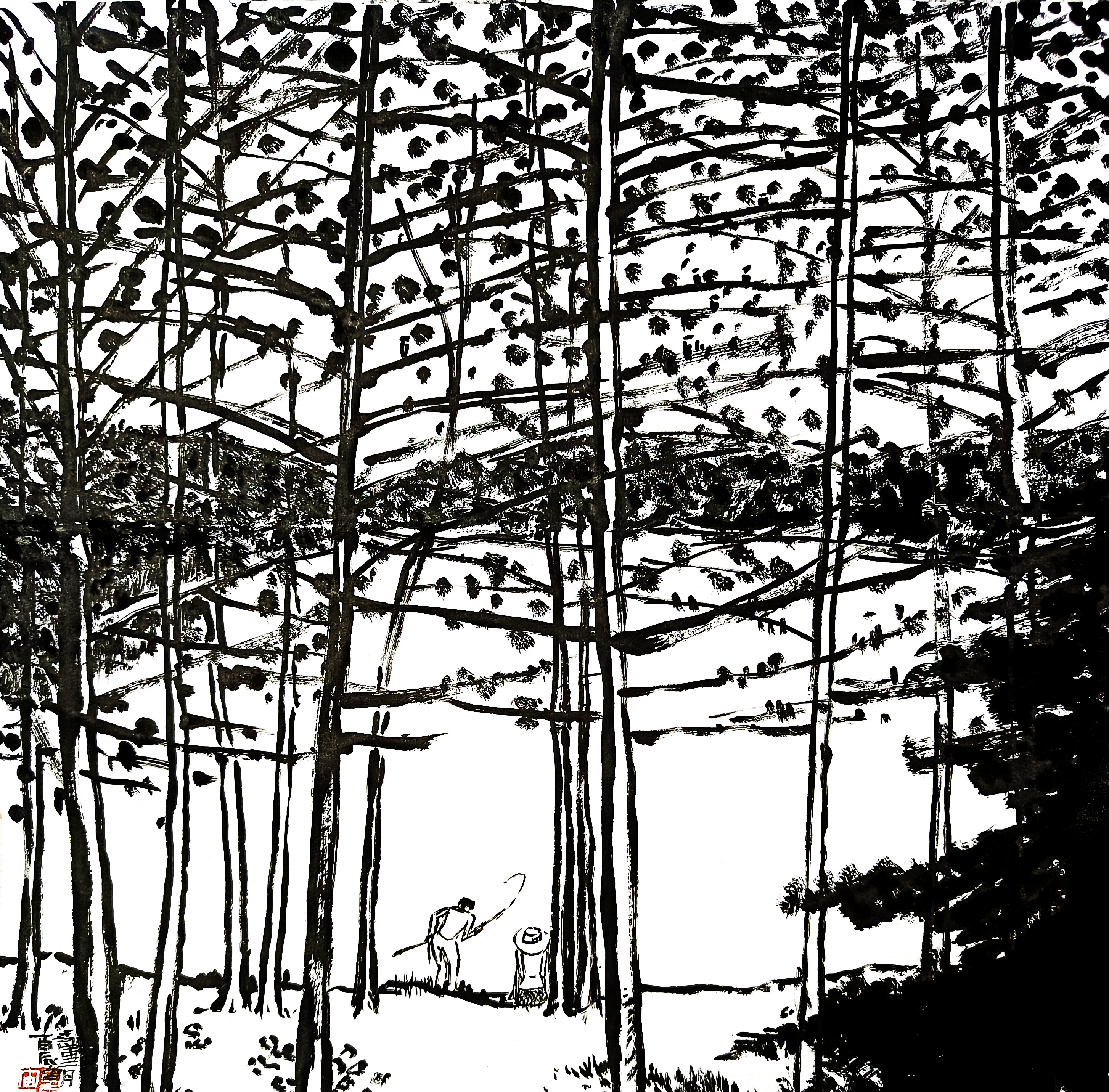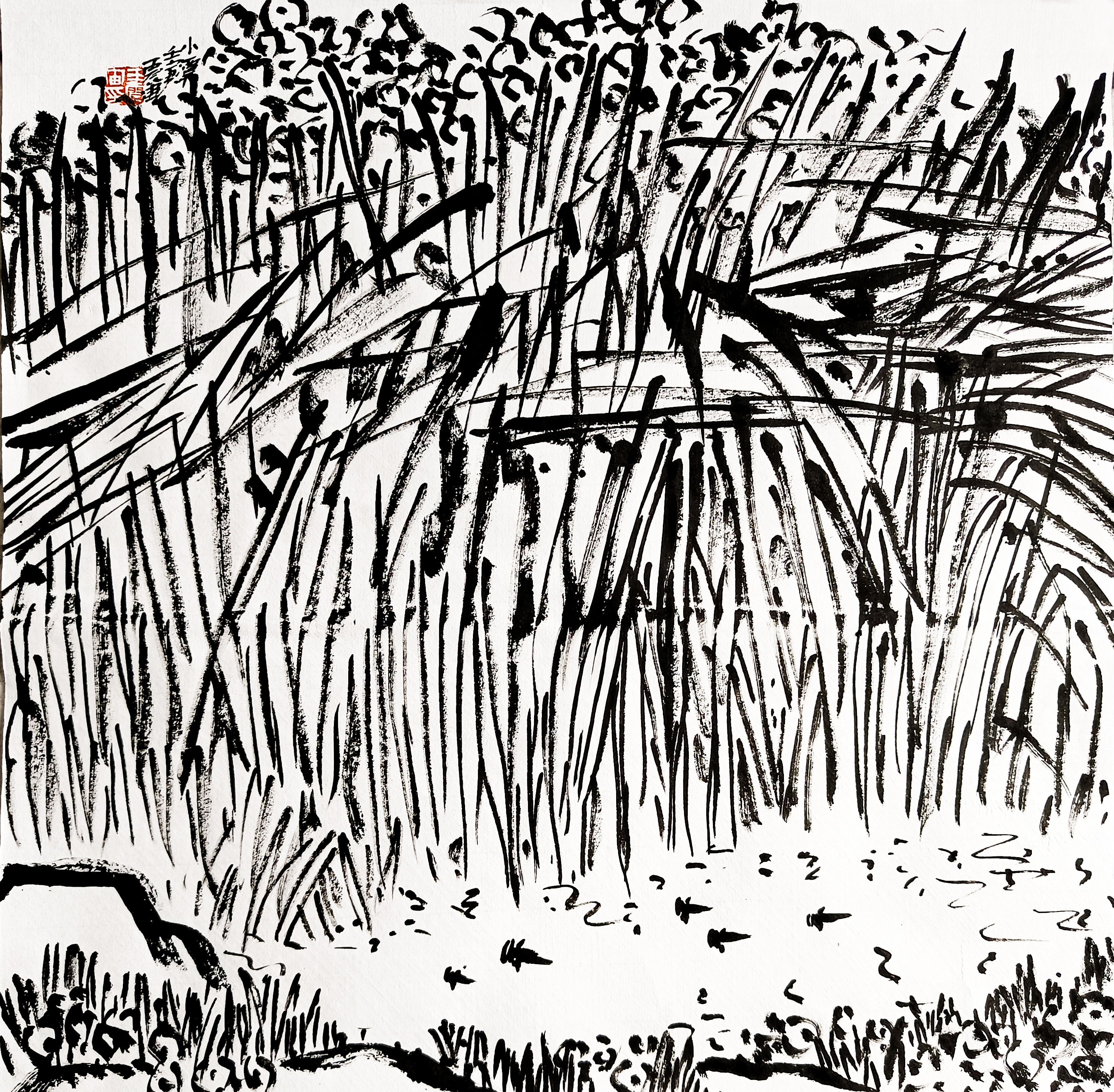 要说中国画笔墨里的“勾、皴、点、染”,显然他都是并不在意的,但在他的画中又看到了在中国画里近乎哲学意味的“既白当黑”,且被他发挥的淋漓尽致。我想,这正是他对中国画的理解再至研究思考的表现,不拘泥形式一味追古而将精神传承不朽,研究、思考、探索—这正是作为一个中国文人该承担的责任。
