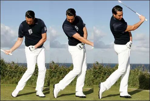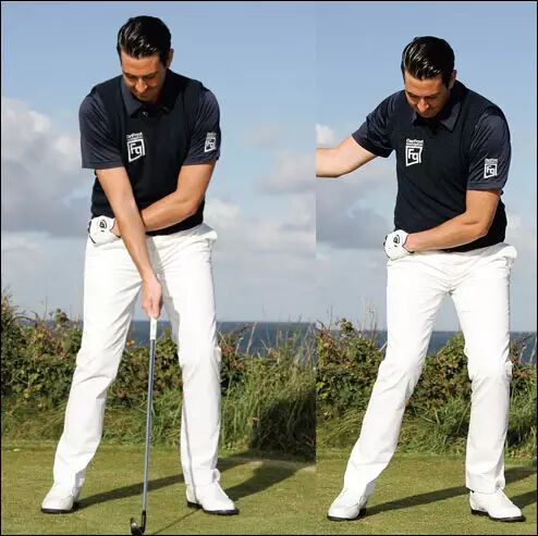 右:在整个挥杆动作中,保持手放在右边口袋上。