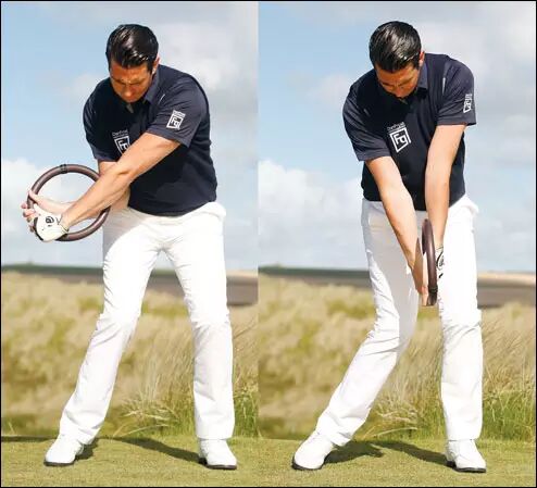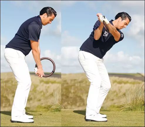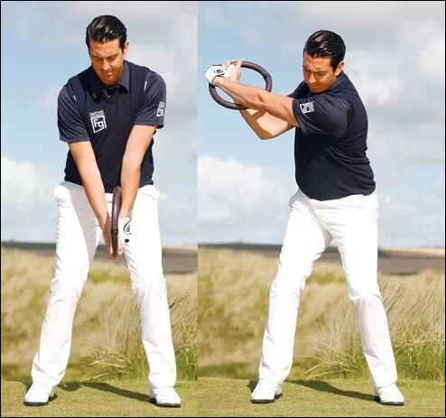 左:保持臀部的转动,给予手臂足够的空间完成挥杆动作。