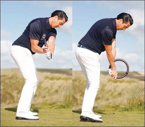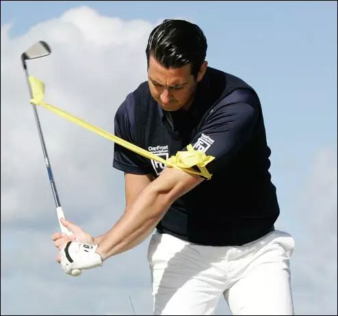 用一条绳子固定在手臂和杆身上,感受正确的挥杆路径。关键在于当转肩时,你如何能保证绳子完全拉伸。